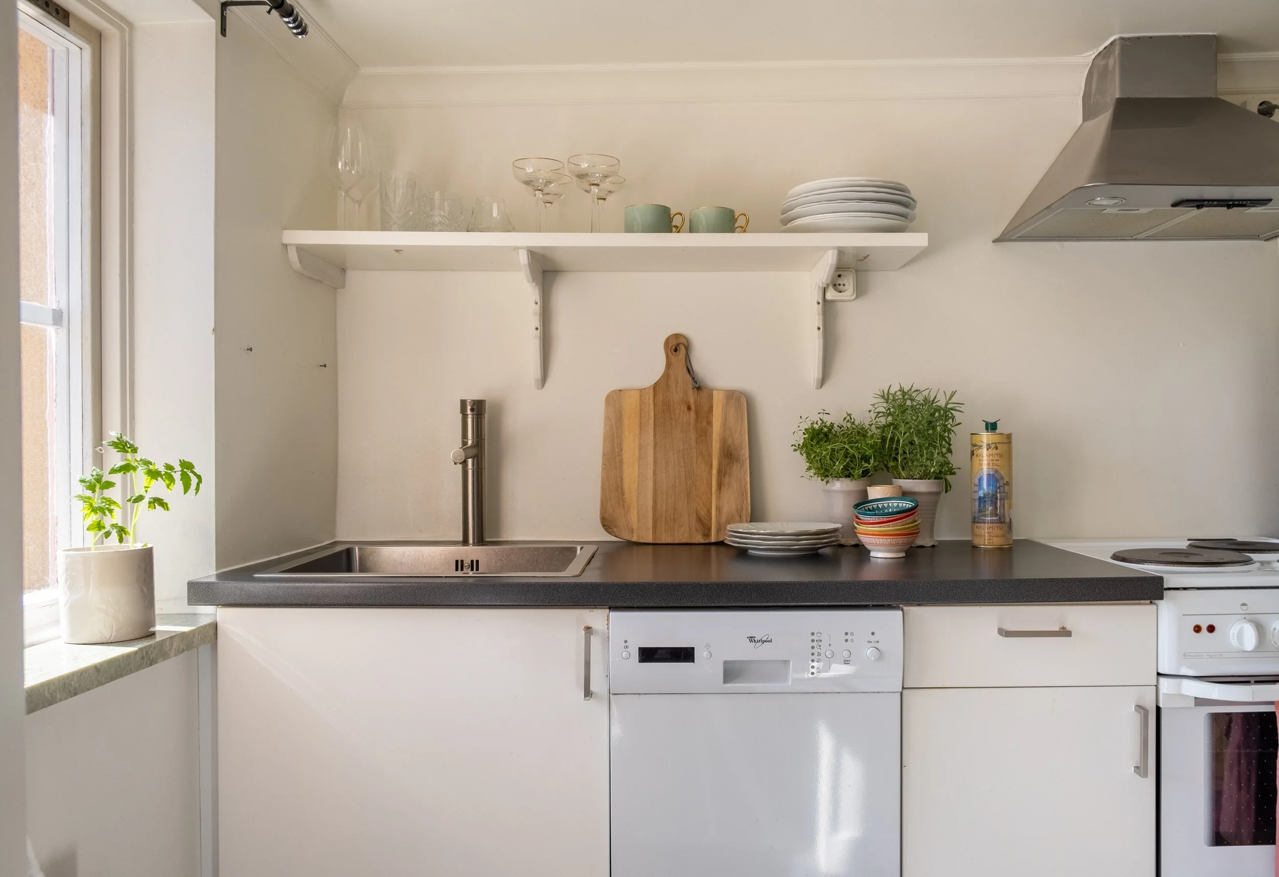 Litet men fullutrustat kök med kyl/frys, spis, ugn, mikro samt diskmaskin.